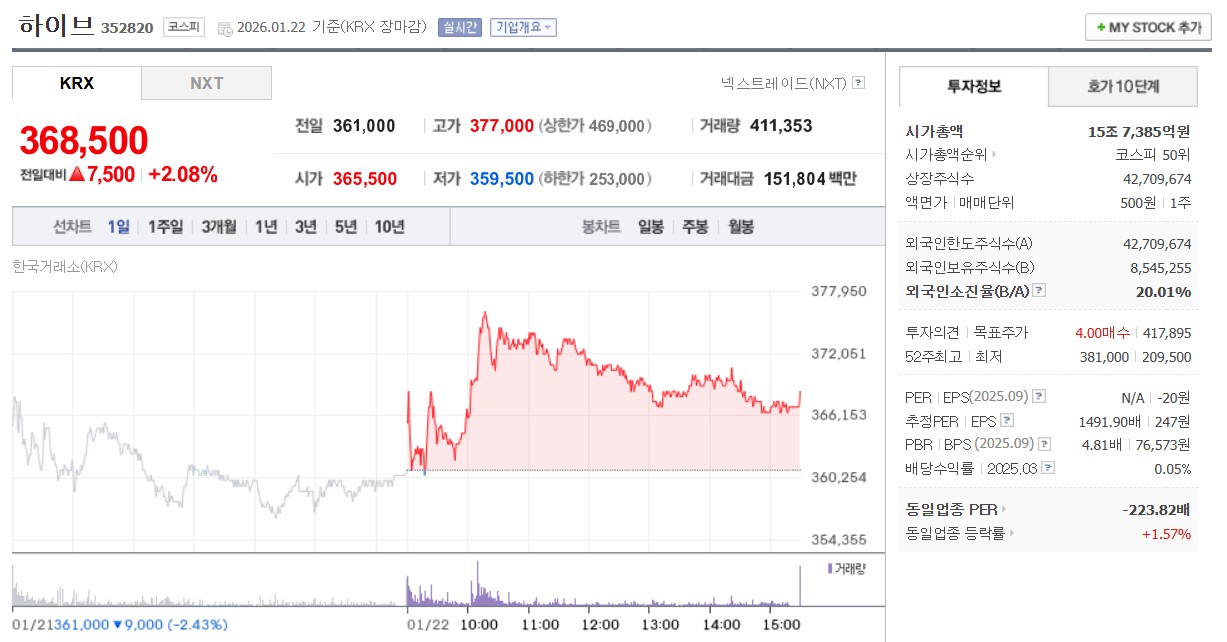 자, 이제 하이브의 차트가 우리에게 어떤 이야기를 들려주는지 살펴보겠습니다. 2026년 1월 22일 기준 하이브는 368,500원으로 마감하며 2.08% 상승했습니다. 최근 주가 흐름은 연초부터 꾸준히 우상향하는 모습을 보여주고 있습니다.