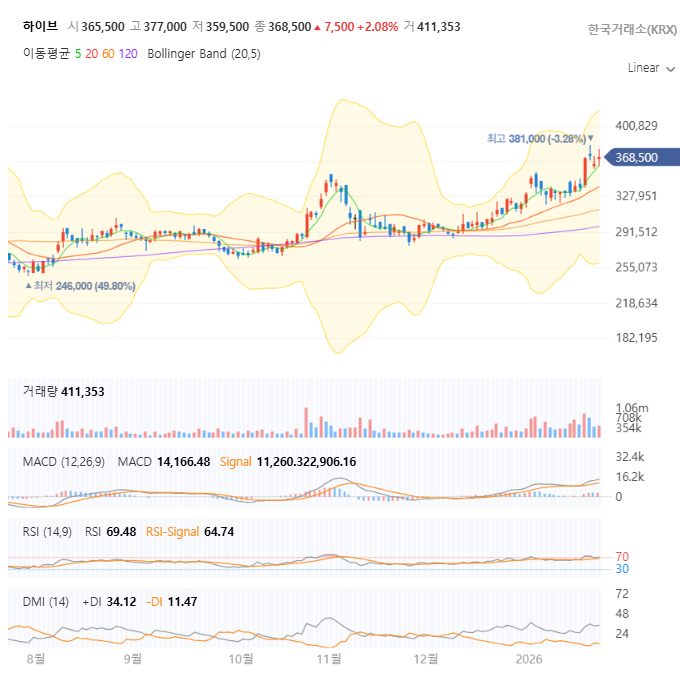 요즘 시장이 어수선한 가운데 우리 하이브 주주님들, 마음고생이 심하시진 않으신가요? 최근 하이브 주가가 368,500원으로 마감하며 상승세를 보였지만, 여전히 '이거 팔아야 하나, 아니면 오히려 기회인가?' 고민이 많으실 텐데요. 그래서 오늘은 하이브에 대해 속 시원하게 파헤쳐 보는 시간을 갖겠습니다. 이 회사가 과연 믿고 갈 만한 펀더멘탈을 가졌는지, 그리고 차트는 우리에게 어떤 힌트를 주고 있는지 함께 살펴보시죠! 😊