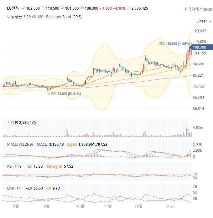 최근 시장이 연초부터 변동성을 보이는 가운데, 우리 LG전자 주주님들, 최근 급등세를 보인 주가에 기쁘면서도 '이 상승세 계속될까? 조정이 오면 어떻게 하지?' 하는 고민이 많으실 텐데요. 오늘 LG전자는 109,300원으로 장을 마감하며 또다시 투자자들의 뜨거운 관심을 확인시켜주었습니다. 그래서 오늘은 LG전자에 대해 속 시원하게 파헤쳐 보는 시간을 갖겠습니다. 이 회사가 과연 믿고 갈 만한 펀더멘탈을 가졌는지, 그리고 차트는 우리에게 어떤 힌트를 주고 있는지 함께 살펴보시죠! 😊